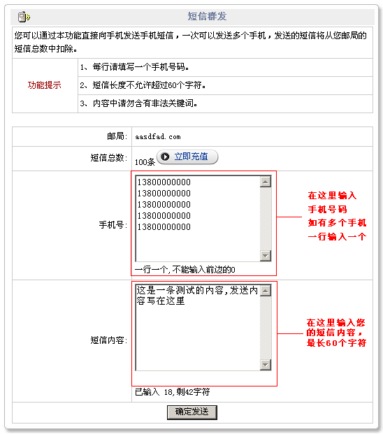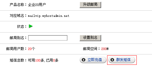 6. 企业短信快速发送: 可以登录 http://www.myhostadmin.net ,选择“邮件管理”,输入域名和密码登录后即可直接群发短信,不用登录365.hk网站也可以发送! 7.我司为了方便用户使用发布了短信群发工具,下载地址2012-2-7更新:http://www.365.hk/services/sms/sendsms.rar 8.开发说明文档及示例下载地址(.net,php,asp) 2012-2-1更新 :http://www.365.hk/services/sms/west263sms_demo.rar