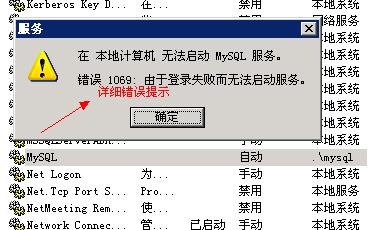 2.MYSQL常见不能启动问题。因安全原因我公司MYSQL服务有用独立用户MYSQL账户运行的,如果不小心更改了这个用户的密码或者删除就造成不能启动,如下图