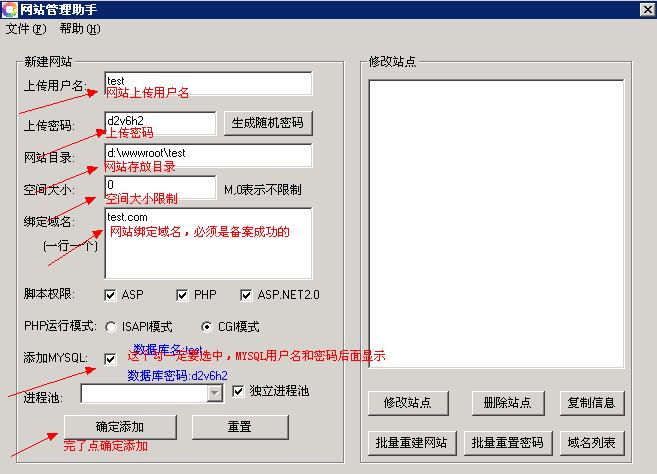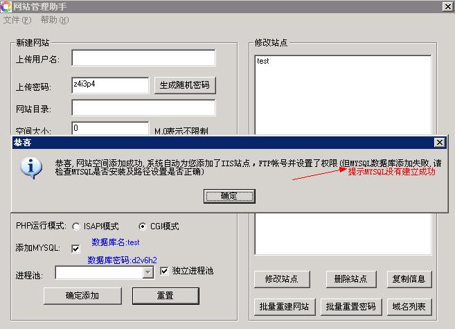 现在MYSQL启动起来,我们就可以用建站助手建立站点和MYSQL了。