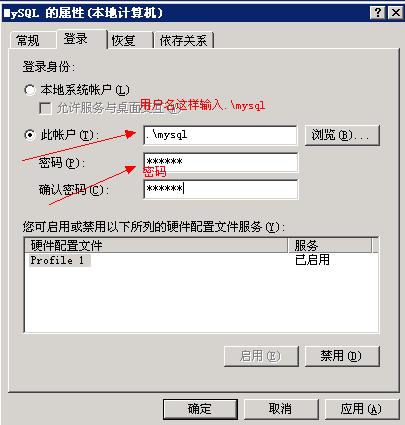 然后到服务管理找到MYSQL服务》右键属性》登录》选中此账户》输入MYSQL用户名和密码,在启动MYSQL就可以了