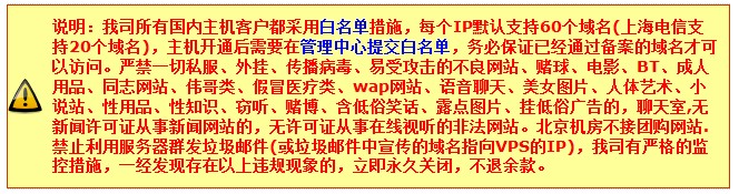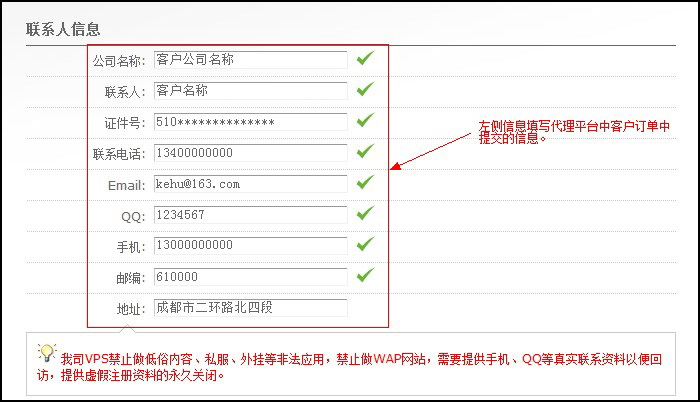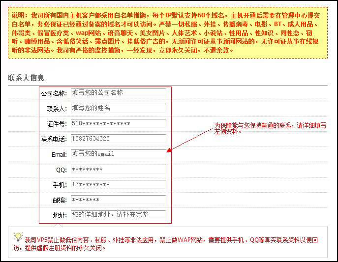 为保障服务质量,能在任何时候联系到您,联系人信息部分,请务必填写真实有效信息,否则审核时VPS可能会断网。 同时我司用红色字体标注了不允许防止的内容,请仔细阅读,一经发现违规内容将立即永久关闭。如图: