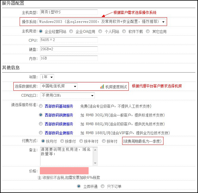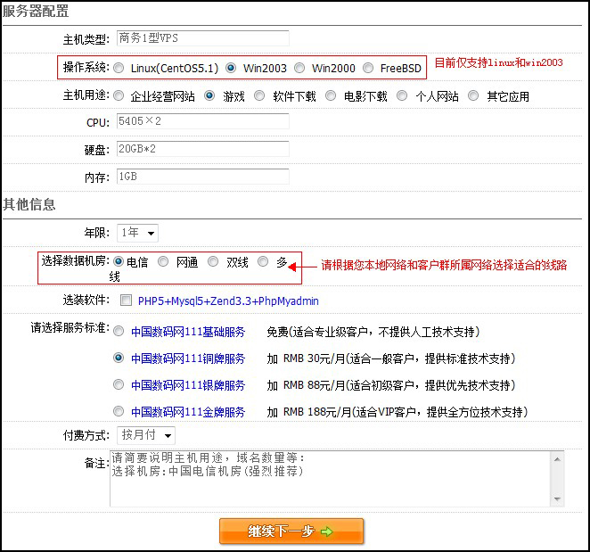 服务器配置部分,请选择您需要的操作系统,目前我司仅支持linux(centos5)和win2003,选择机房时,请根据您本地 的线路和客户群的线路选择适合的机房。选装软件请打钩。如图: