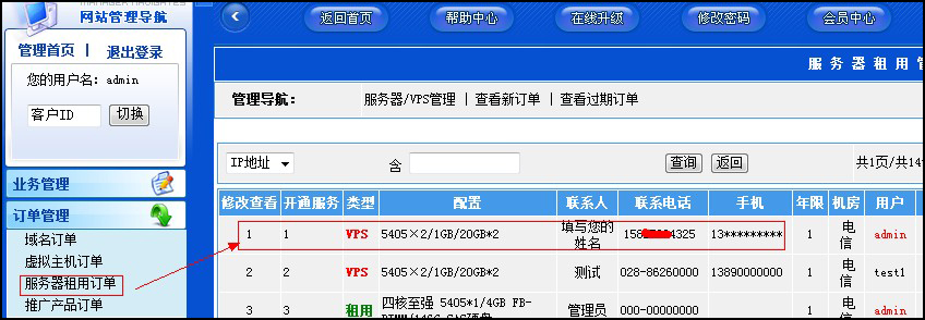 客户在代理平台提交订单后,管理员可以登陆代理平台后台,在“订单管理”—“服务器租用订单”看到VPS的订单,并按照订单 要求在我司开通VPS。如图(客户订单):