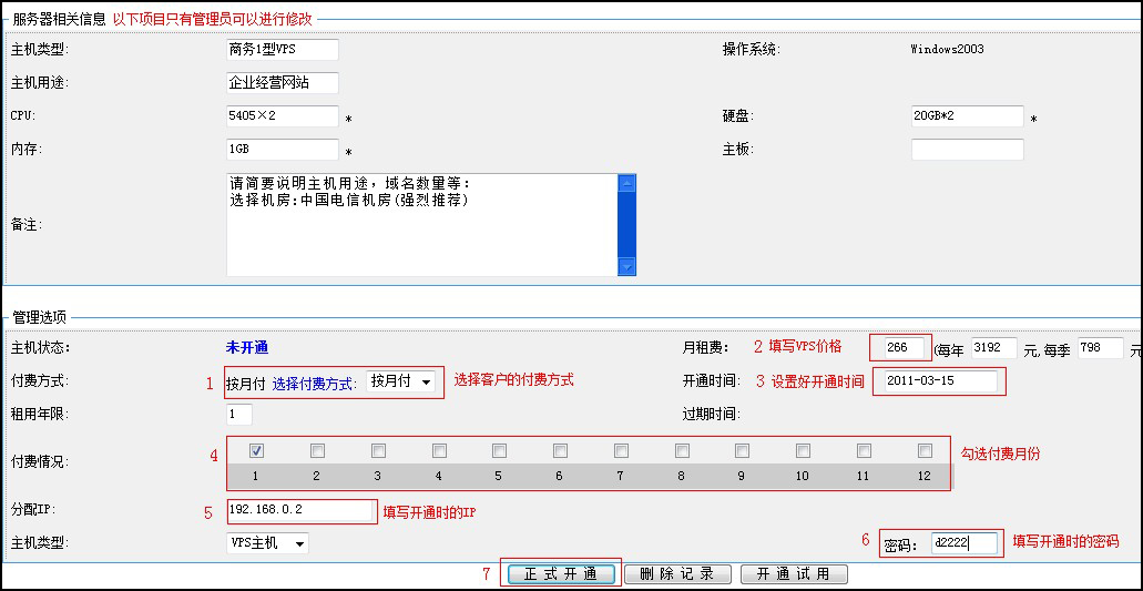 代理商在代理平台开通VPS流程: 开通VPS后,管理员重新登陆代理平台后台,在“订单管理”—“服务器租用订单”,找到客户的订单,点击右侧的“查看 编辑”,将VPS信息更新为我司管理中心的VPS信息并点击“正式开通”,开通时需确保用户下有足够的款项,否则无法开通。如图: