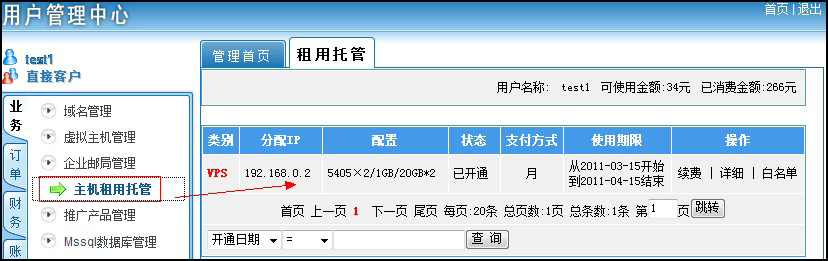 管理员开通后,客户即可在自己的管理中心查看到相关的价格、到期日期、VPS登陆账户及密码等信息,若要提交白名单和 更多管理,请点击最右侧的“白名单”或直接登录www.myhostadmin.net。如图: