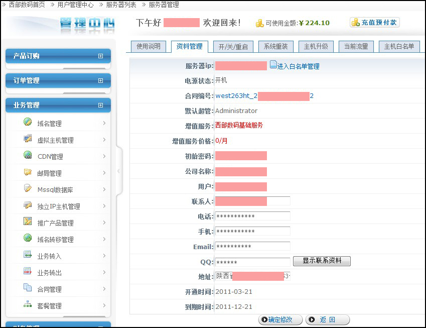 开通成功后,系统会提示您相关的IP和账户密码信息,也可以在管理中心—“独立IP主机管理”查看到相应的信息,如图(服务器信息):