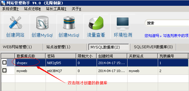 网站管理助手创建、导入恢复、导出备份mysql数据库首先请确保您的服务器使用的是我司默认的环境配置,如果您是自己手工配置的环境,则以下操作可能会报错或失败。 Mysql的建立: 1.打开我司网站管理助手,点击“创建mysql”