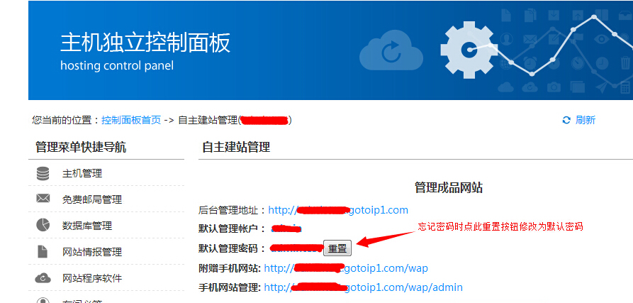 在我司购买的成品网站程序,如果忘记了后台管理用户名或密码的,可以访问:http://www.myhostadmin.net虚拟主机-输入ftp账号密码登录后-管理站点-查看账号密码或点击“重置”按钮即可修改为默认的密码。
